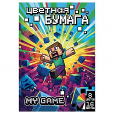 77125 Бумага цветная My Game, немелованная (газетка) односторонняя, на скрепке, обложка мелованная 150гр. 16 листов, 8 цветов, плотность блока 48,8м2