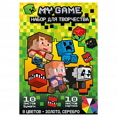 77114 Картон + Бумага My Game, картон мелованный односторонний 10 листов, 10 цветов (8 цветов +золото+серебро) + бумага мелованная односторонняя 10 цветов (8 цветов +золото+серебро) – размер 205*294, в папке