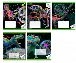 71637К Тетрадь Динозавры неон, формат А5, 18 листов с полями, клетка, на скрепке, внутренний блок офсет 60-65 г, 92% белизна, обложка мелованный картон+ВД лак, 5 дизайнов в спайке, 20 шт. в спайке