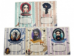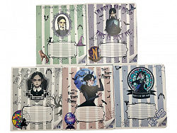74048 Тетрадь Вэнсдэй коллаж, формат А5, на скрепке, 18 листов, линейка с полями, внутренний блок офсет 60-65 г, 92% белизна, обложка мелованный картон + ВД-лак, 5 дизайнов в спайке
