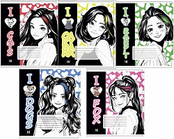73989 Тетрадь I love..., формат А5, на скрепке, 18 листов, линейка с полями, внутренний блок офсет 60-65 г, 92% белизна, обложка мелованный картон + Уф-лак, 5 дизайнов в спайке
