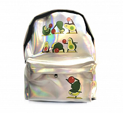 87610 Рюкзак мягкий Авокадо, 1 отделение на молнии с подкладкой, большой передний карман, внутренний карман, усиленно дно "тилит", усиленные лямки. Материал - серебристый кожзам с полноцветной печатью, размер 39х30х14 см.