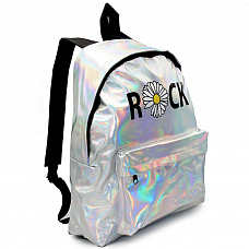 70356 Рюкзак мягкий Рок с ромашкой на кожзаме,1 отделение на молнии с подкладкой, большой передний карман, внутренний карман, усиленно дно "тилит", усиленные лямки. Материал - серебристый кожзам с полноцветной печатью, размер 39х30х14 см.
