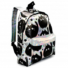 70355 Рюкзак мягкий Коты-пушистики на кожзаме,1 отделение на молнии с подкладкой, большой передний карман, внутренний карман, усиленно дно "тилит", усиленные лямки. Материал - серебристый кожзам с полноцветной печатью, размер 39х30х14 см.