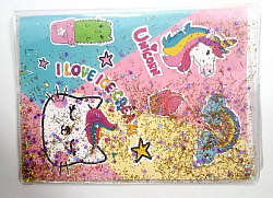 90240 Блокнот "Кот и Единорог", формат А6, 11х15 см, 56 листов в клетку на скрепке, обложка с гелевым наполнением, глиттер внутри, морозостойкий