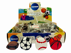 89806 Ластик (синтетический каучук) Мяч 25x25 мм, дизайны ассорти (футбольный, баскетбольный, теннисный, мяч для регби), в индивидуальной упаковке, в дисплее