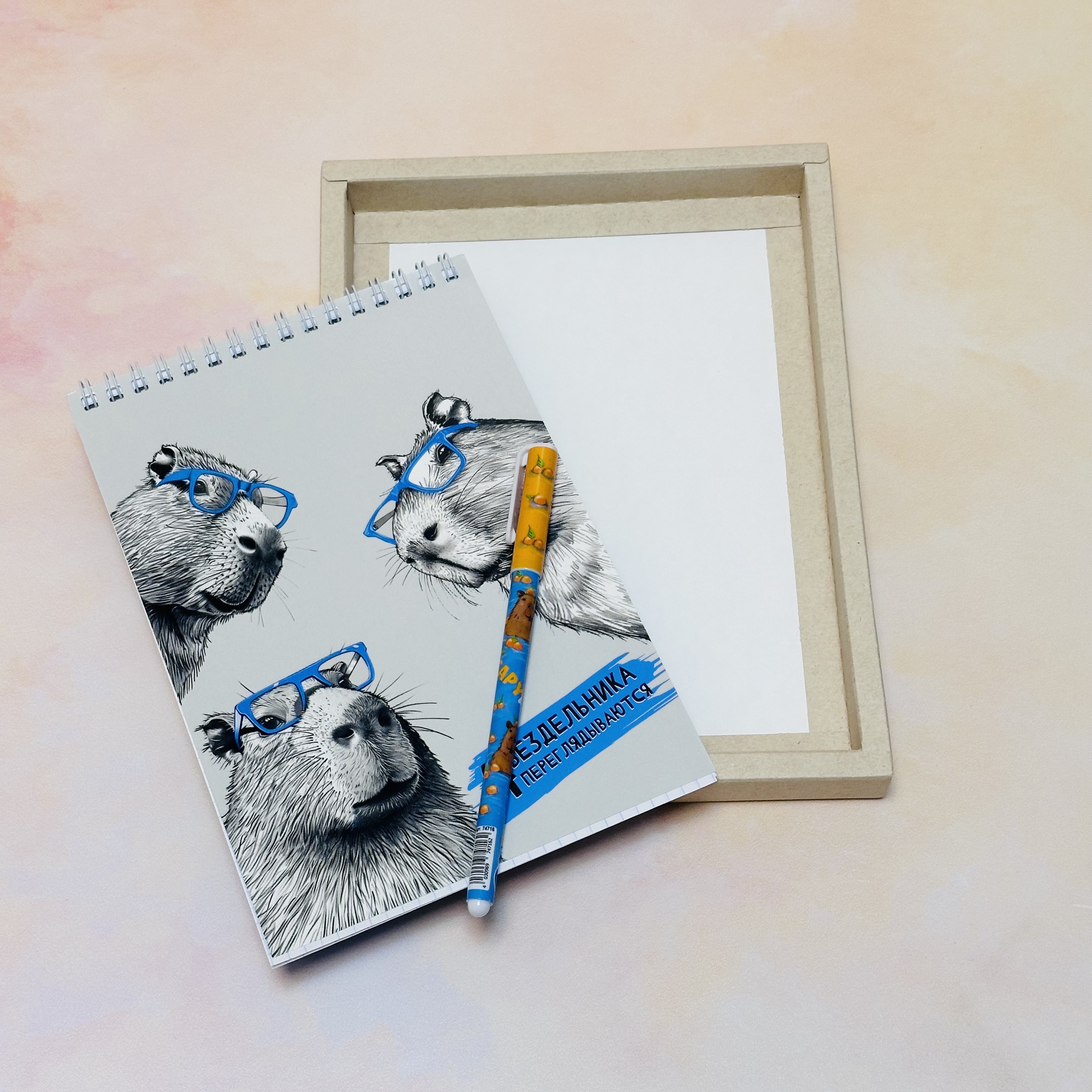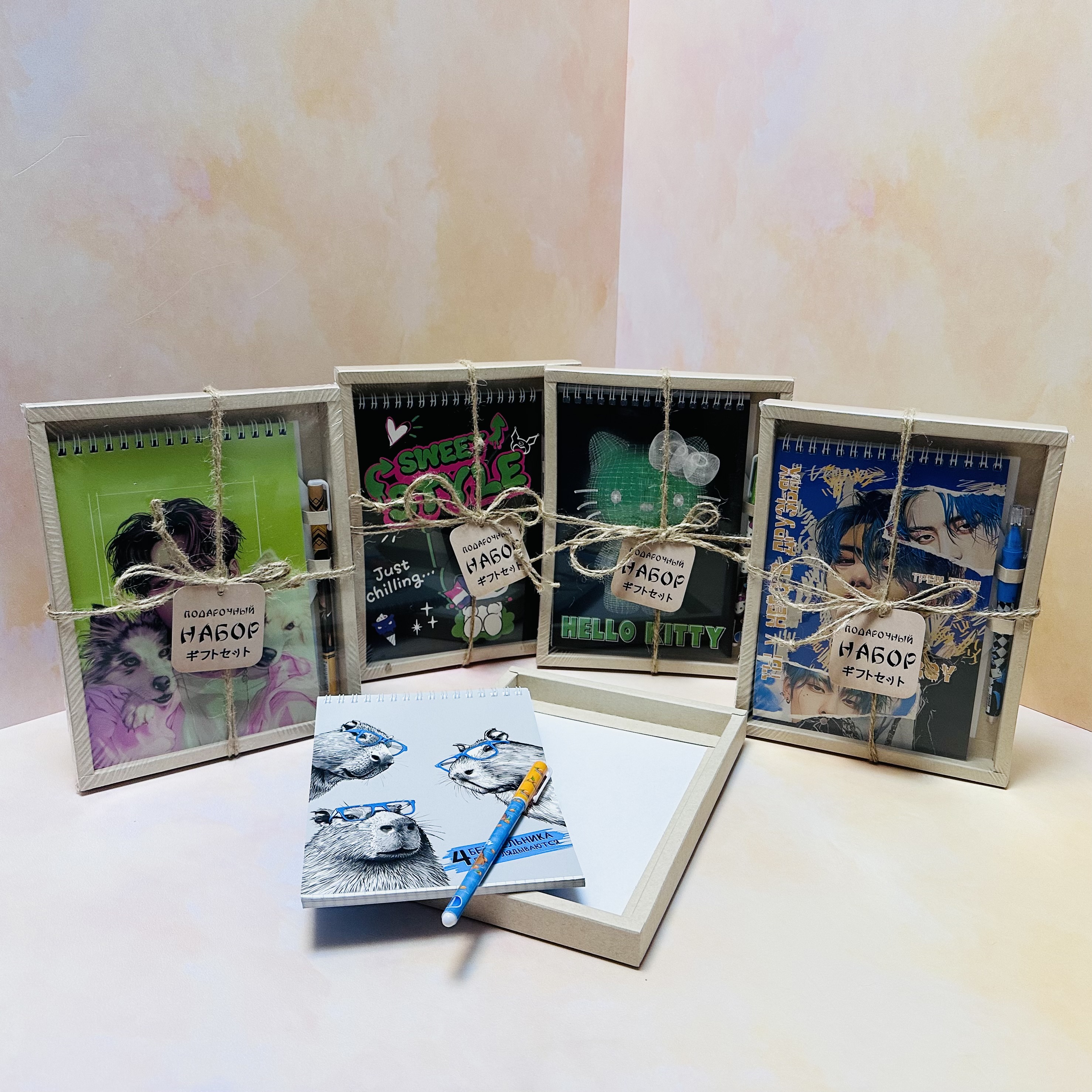 В ассортименте актуальные дизайны на обложках блокнотов и не менее креативные ручки.
