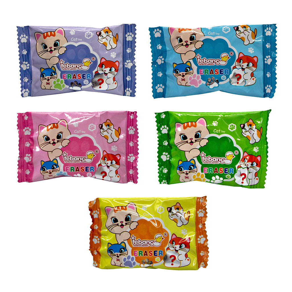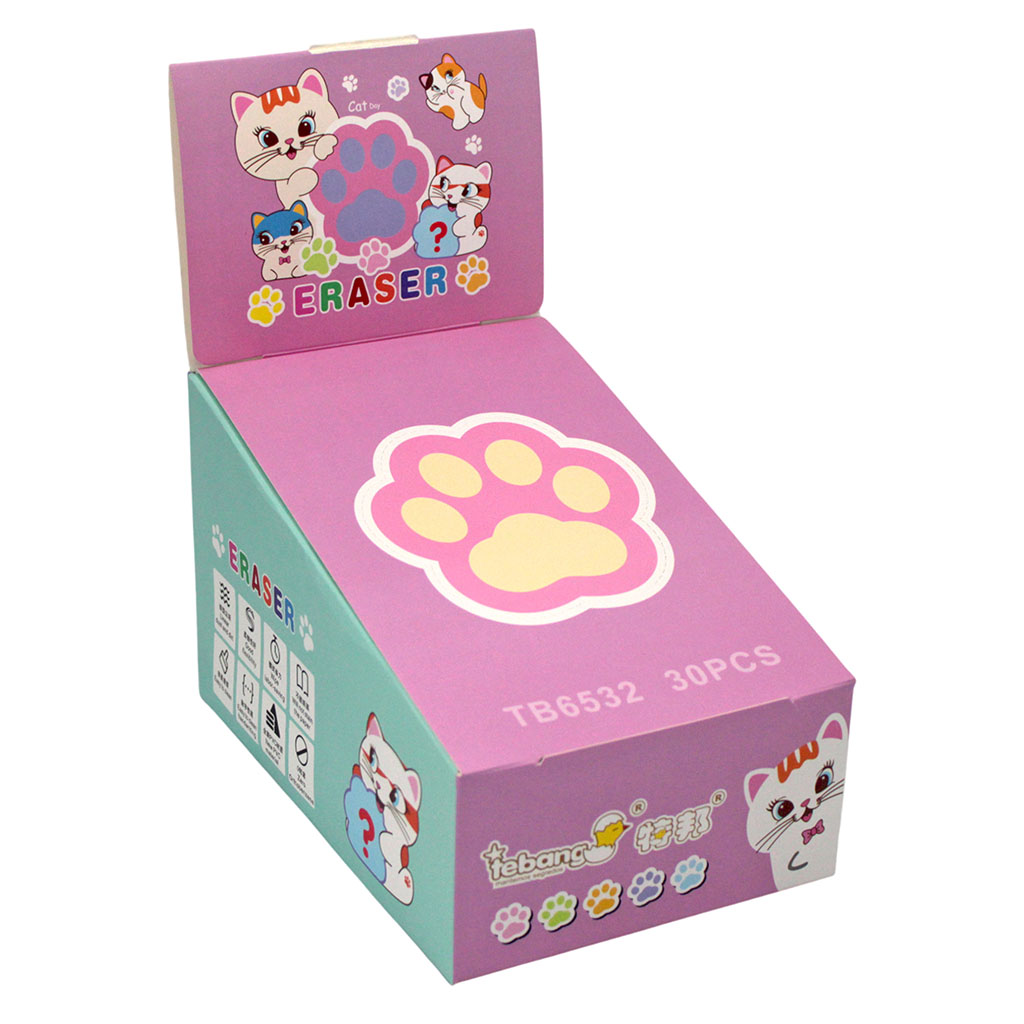 Новые ластики из синтетического каучука. Привлекательная форма кошачьей лапки. Мягкие и приятные на ощупь, без следа удаляют надписи, сделанные цветными и чернографитными карандашами. Каждый ластик имеет индивидуальную упаковку. Цвет упаковки соответствует цвету ластика. Упаковка – фирменный картонный стенд.