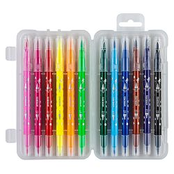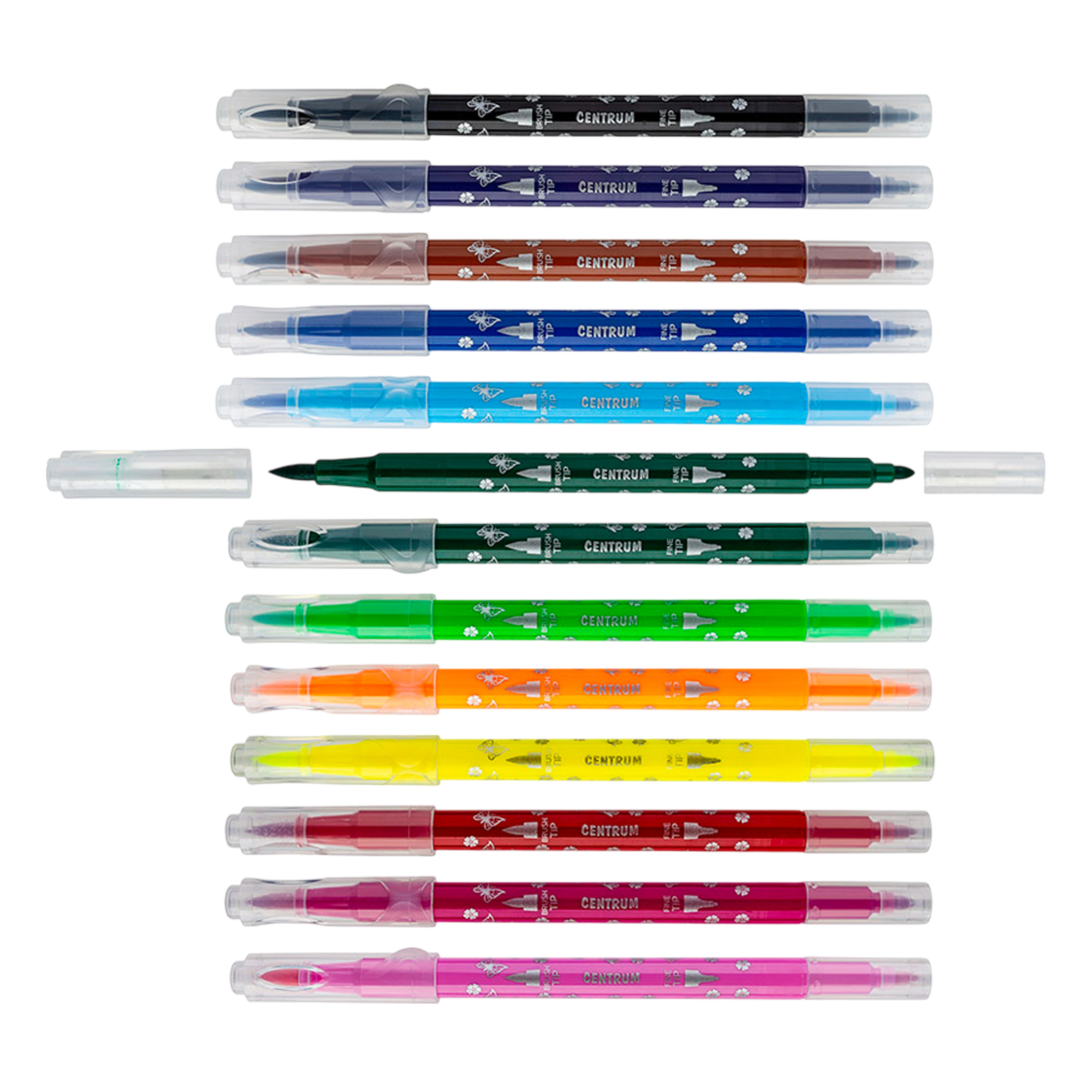 Новые двусторонние фломастеры с кисточкой Centrum – это сочетание основных преимуществ классического фломастера и живописи. Круглый корпус с прозрачными колпачками оснащен двумя наконечниками, классическим и наконечником –кисточкой. Цвет чернил соответствует цвету корпуса. Специальный наконечник-кисточка позволяет создавать цветовые переходы, закрашивать участки изображения подобно акварельной технике, а также получать четкие линии и прорабатывать мелкие детали. Чернила не имеют резкого запаха, ложатся тонким слоем, не пропитывая бумагу.