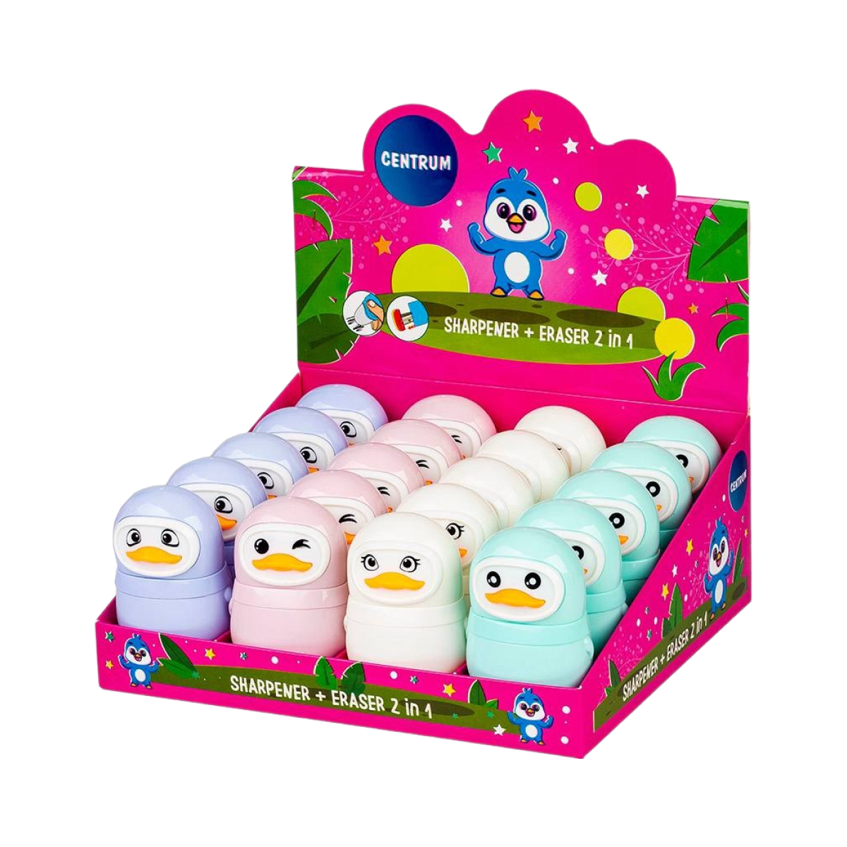 Яркие точилки, дополненные ластиком, существенно сэкономят место в пенале и не отнимут дополнительного времени на поиски нужного предмета. Изделия оснащены острыми лезвиями из высококачественной стали, производящую быструю и точную заточку, без следов срезов и повреждений. В ассортименте одинарные точилки, рассчитанные для затачивания стандартных трехгранных, шестигранных, круглых, чернографитных и цветных пластиковых и деревянных карандашей.