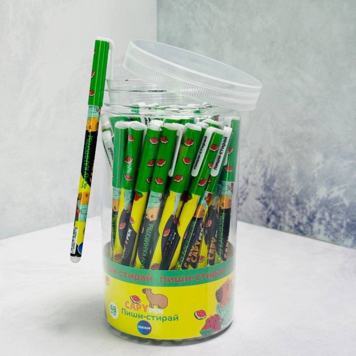 Гелевые ручки для аккуратного и безошибочного письма. Мгновенная корректировка линий любой толщины без следов и деформации бумаги с помощью ластика, расположенного на верхней части ручки. После удаления чернил, исправленная область моментально готова к продолжению работы с ней. Модели представлены в разноцветном пластиковом корпусе с колпачком. Полноцветная печать на корпусе обеспечивает четкое нанесение рисунка, устойчивое к деформации. Металлический игольчатый наконечник диаметром 0,5 мм. производит бесперебойную подачу чернил, обеспечивая мягкое и плавное письмо. Чернила оптимальной консистенции, ложатся тонким равномерным слоем, мгновенно высыхая и не размазываясь.