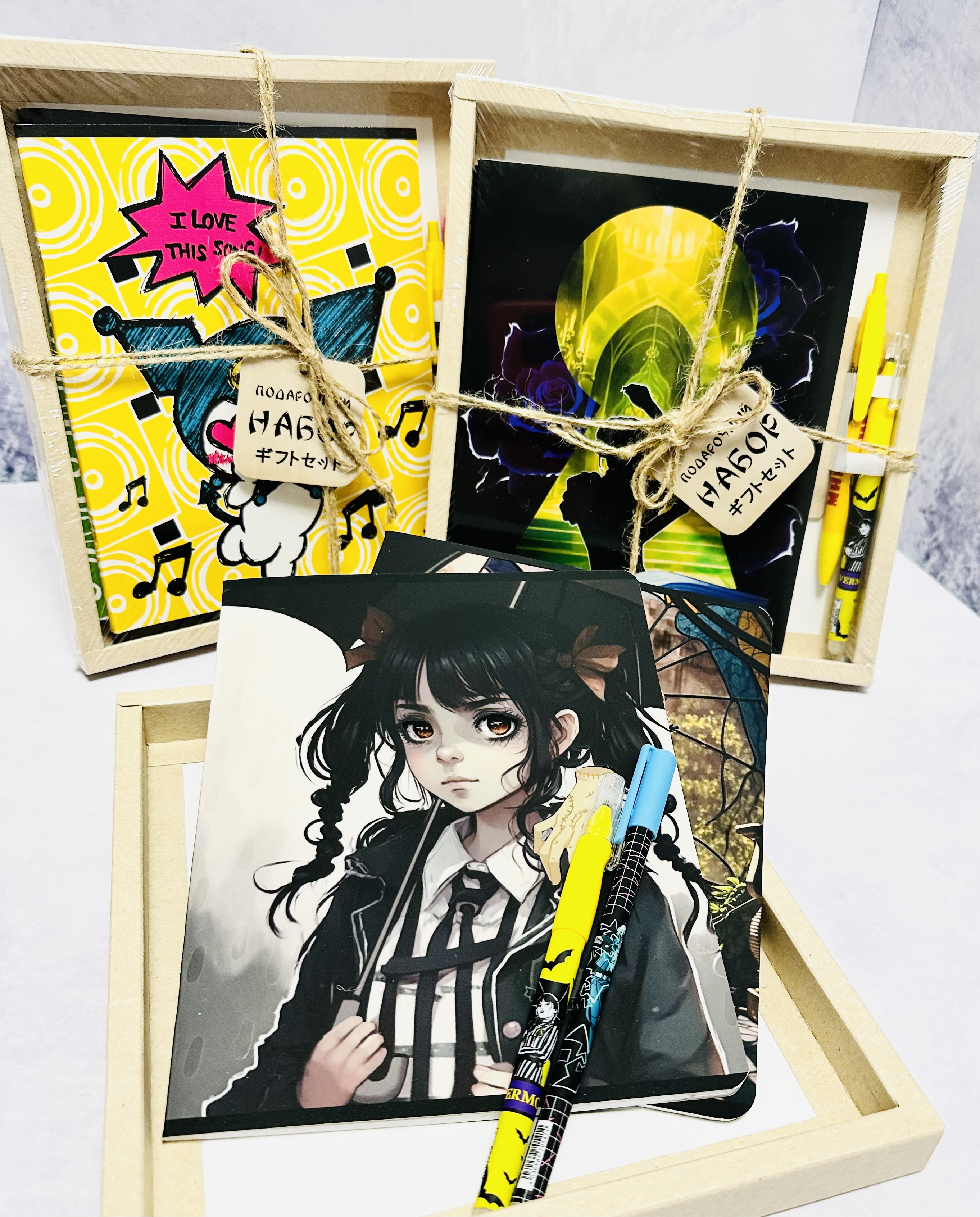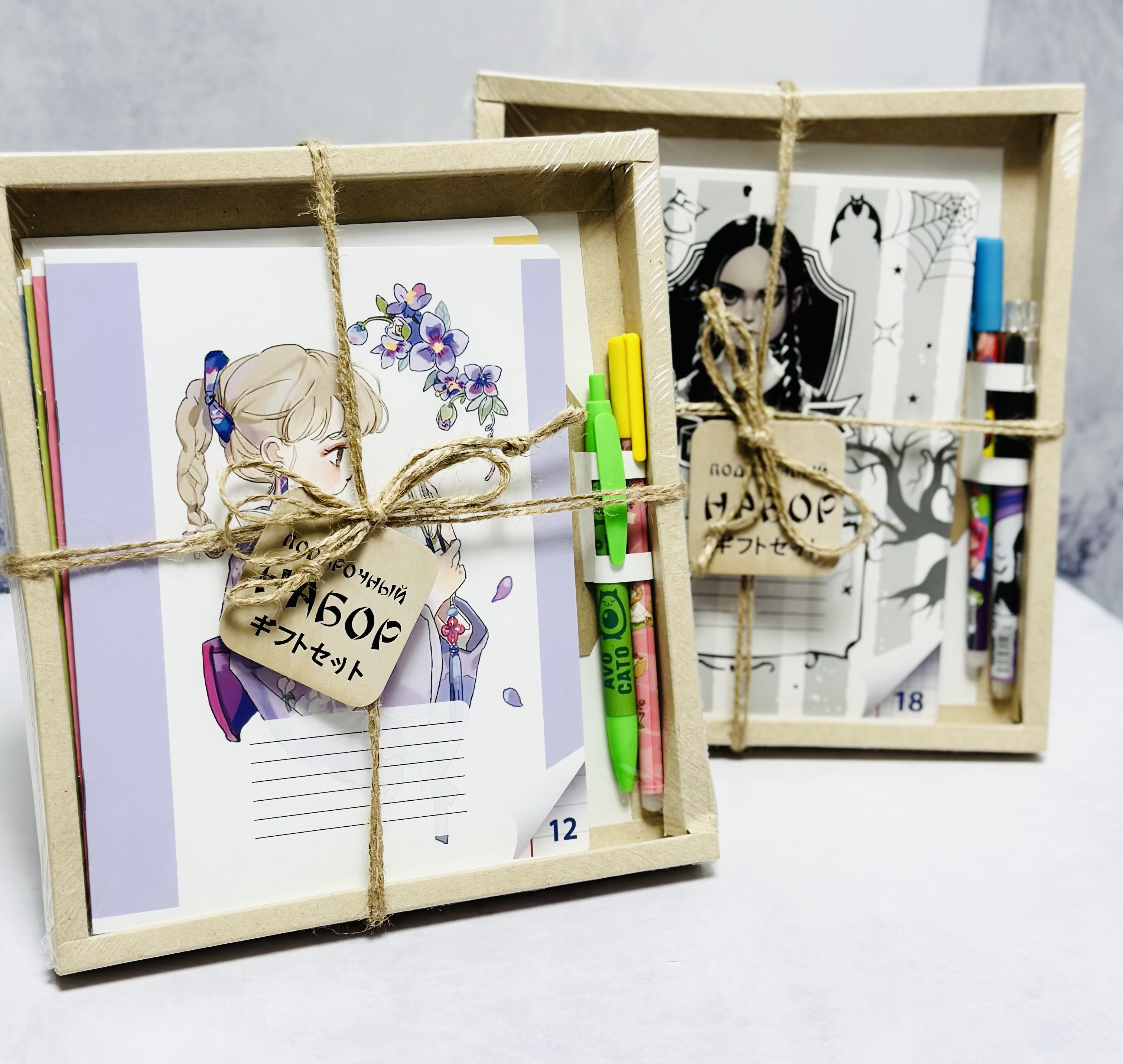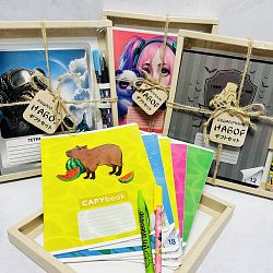 В каждом наборе тетради в объеме 12,18,48 листов (клетка/линейка) в количестве 2,4,6 шт. и две ручки.