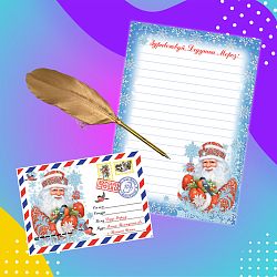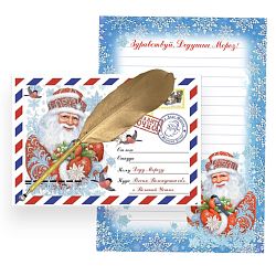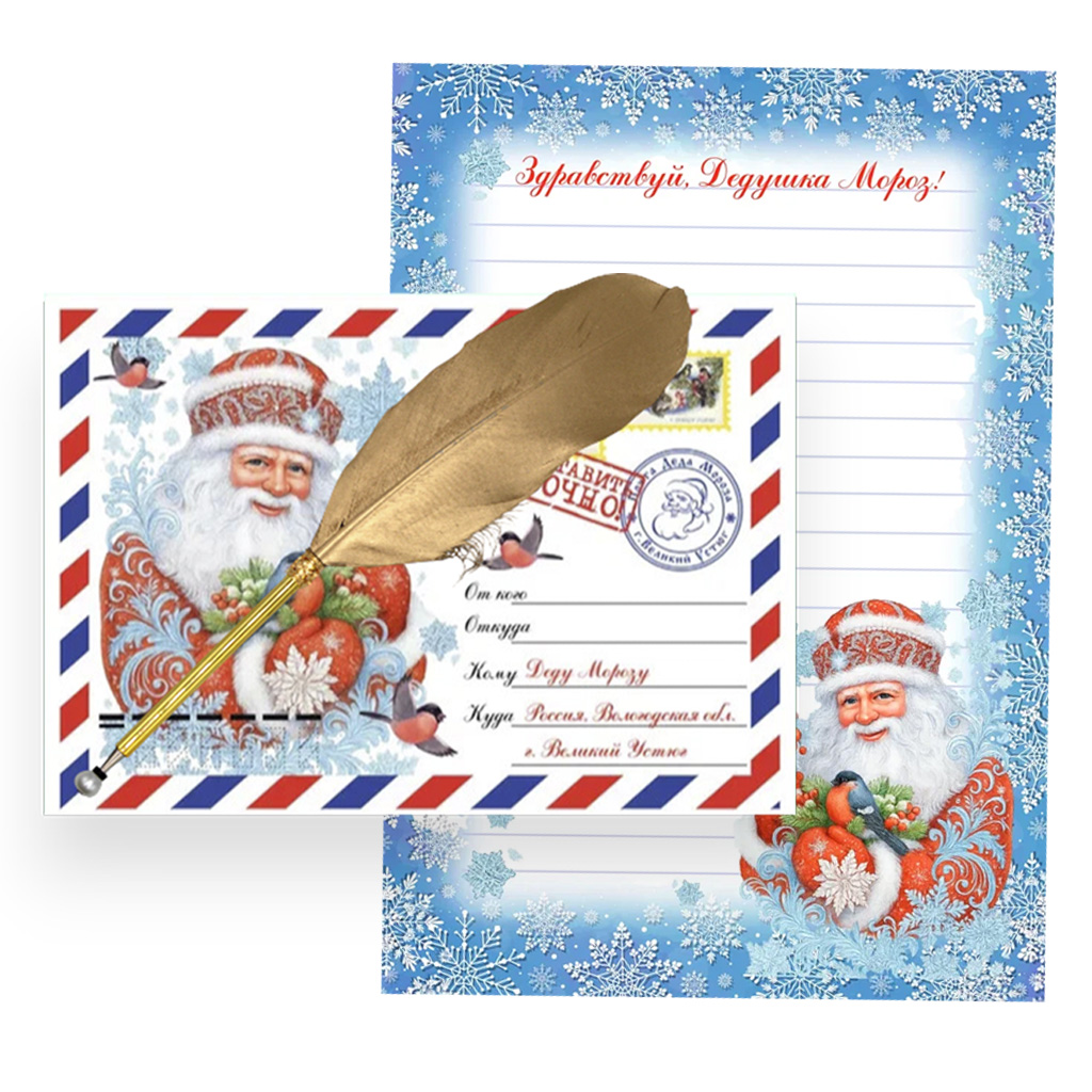 В комплекте все необходимое для новогоднего чуда: праздничный бланк, волшебная шариковая ручка с золотистым покрытием и эффектным дополнением - пером; почтовый конверт с адресом Деда Мороза.