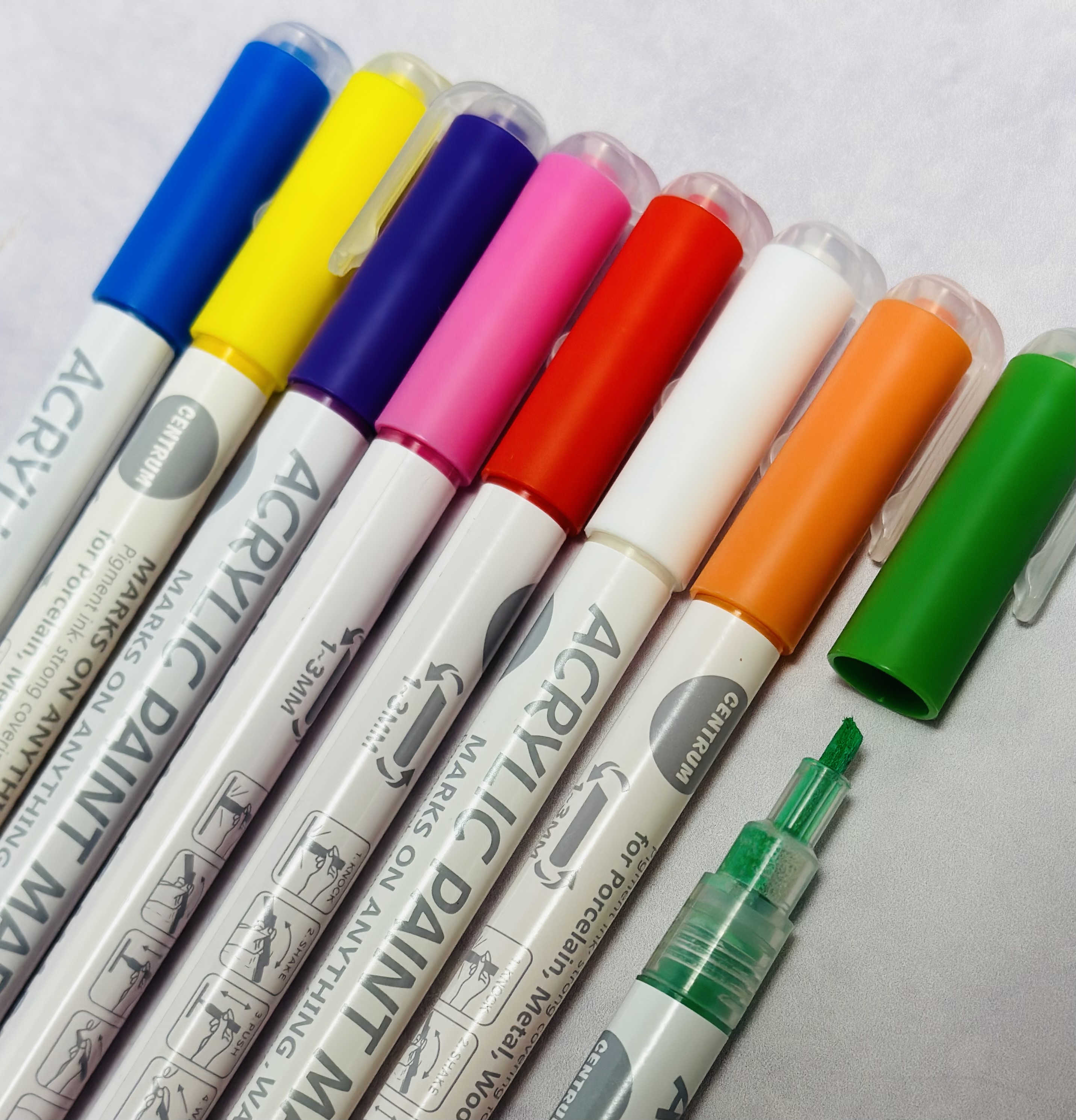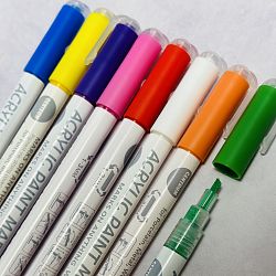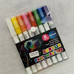 Это отличная альтернатива для любителей акриловых красок. Применение их востребовано в творческой деятельности, как правило, это различные виды декоративных техник. Маркеры используются на любых поверхностях, благодаря чему помимо рисунков и целых композиций на бумаге и холсте, удобны в создании граффити и росписи стекла, ткани, дерева, керамики, металла. Чернила не размываются водой, после высыхания приобретают насыщенную пленочную поверхность. Главная особенность – двухсторонний вынимающийся грифель. Скошенный наконечник позволяет формировать ровные линии толщиной до 3 мм., выделять изображения, круглый наконечник толщиной 1 мм. удобен для художественной работы и оформления. Для смены наконечника грифеля необходимо извлечь его из корпуса и поместить обратно нужной стороной. В первоначальном виде стержень не пропитан чернилами, принцип его работы сравним с дозатором. Для начала использования требуется пропитать стержень чернилами, нажатиями на него и повторять данное действие по мере необходимости. В наборе 8 основных цветов. Пластиковая упаковка с европодвесом.