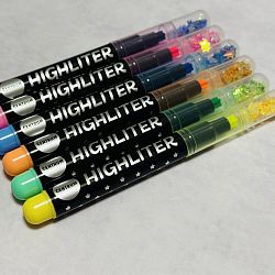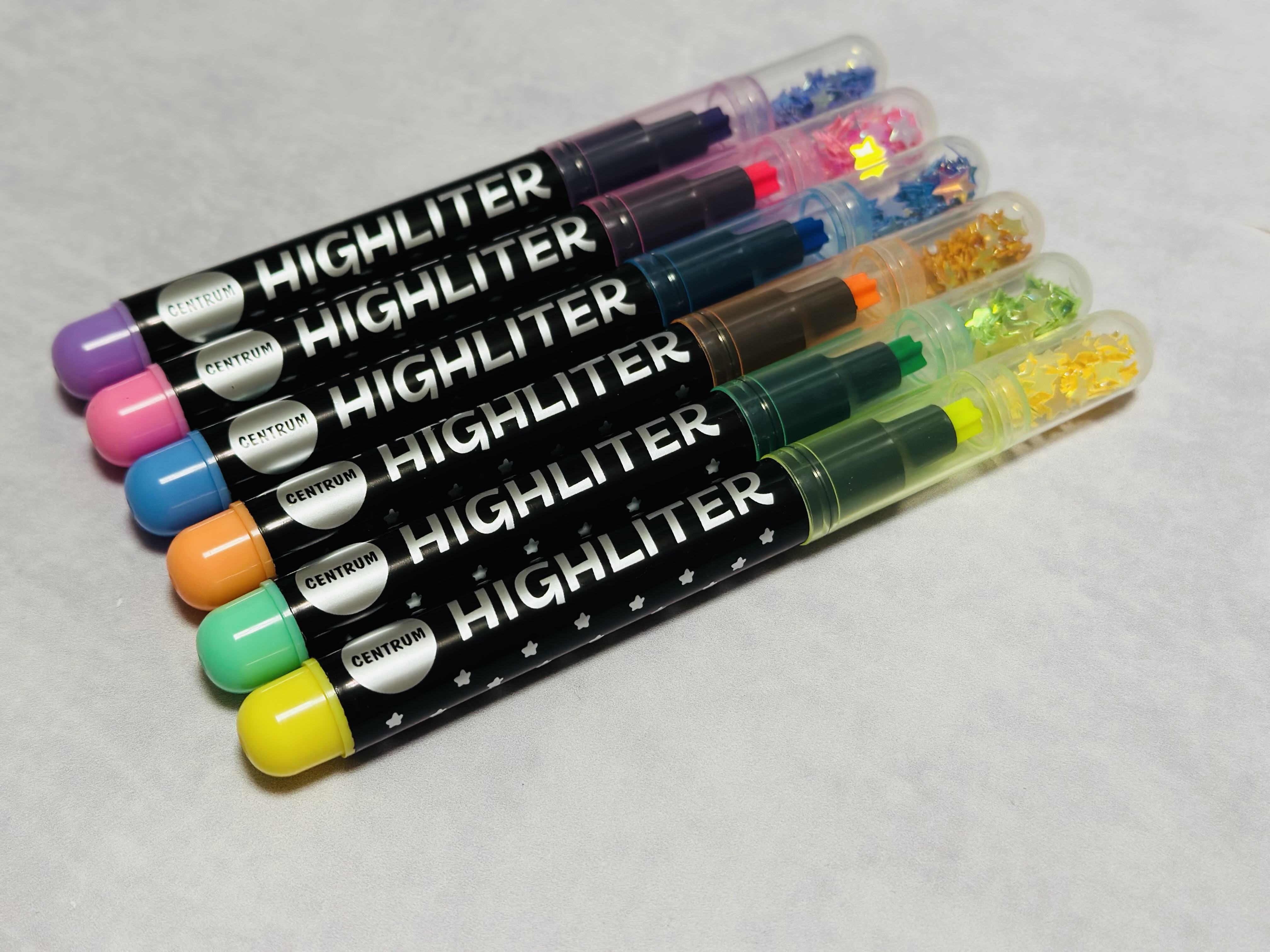 Новые маркеры Centrum - это стильный дизайн корпуса, фетровый наконечник в виде звезды и насыщенная палитра из ярких неоновых оттенков. Каждый колпачок наполнен мерцающими пайетками – звездами. Приятный декоративный элемент дизайна будет радовать и привлекать внимание. Чернила не имеют резкого химического запаха, мгновенно высыхают, не отпечатываясь на обраной стороне. Устойчивы к выцветанию, выделенная область не теряет первоночальной яркости со временем.