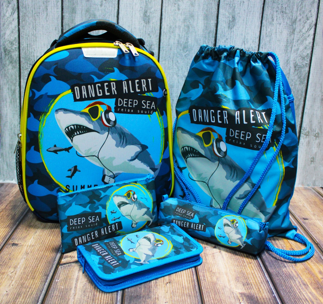 Данная особенность позволяет равномерно распределить нагрузку по позвоночнику, тем самым предотвращая нарушение осанки, обеспечивая максимальный комфорт при носке. Каждый дизайн пеналов продублирован в нескольких вариациях моделей, различных по форме и размеру. В ассортименте плоские и объемные модели, а также корпусные пеналы с одним отделением. Мешки для обуви имеют одно отделение, затягивающееся с помощью текстильных шнурков, также выполняющих функцию лямок, позволяя носить мешок в руке и за спиной. Дополнены текстильной петлей для подвеса. Модель коллекции «Акула. Арт.:70145» дополнительно имеет карман на молнии.Материалы: полиэстер, нейлон.