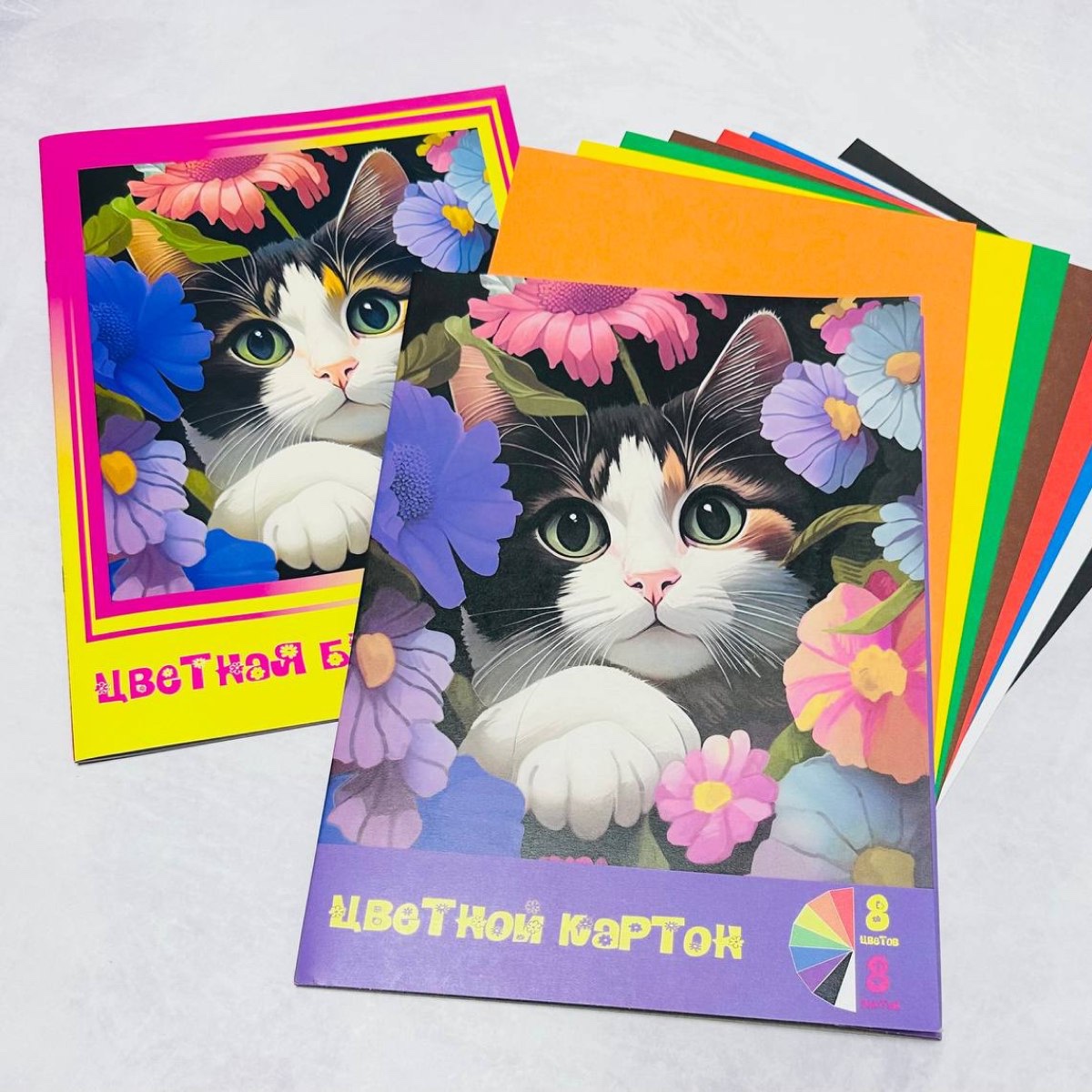 Наборы цветного картона представлены в картонной папке, удобной для хранения и транспортировки, в наборе из 8 листов. Формат – А4.