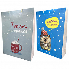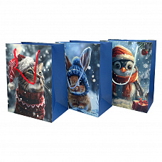 72662 Пакет подарочный Новогодние зверушки, ламинированный бумажный 35*40 см, ручки - полипропиленовые веревки, 3 дизайна в ассортименте
