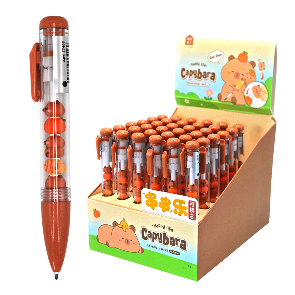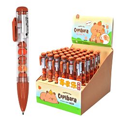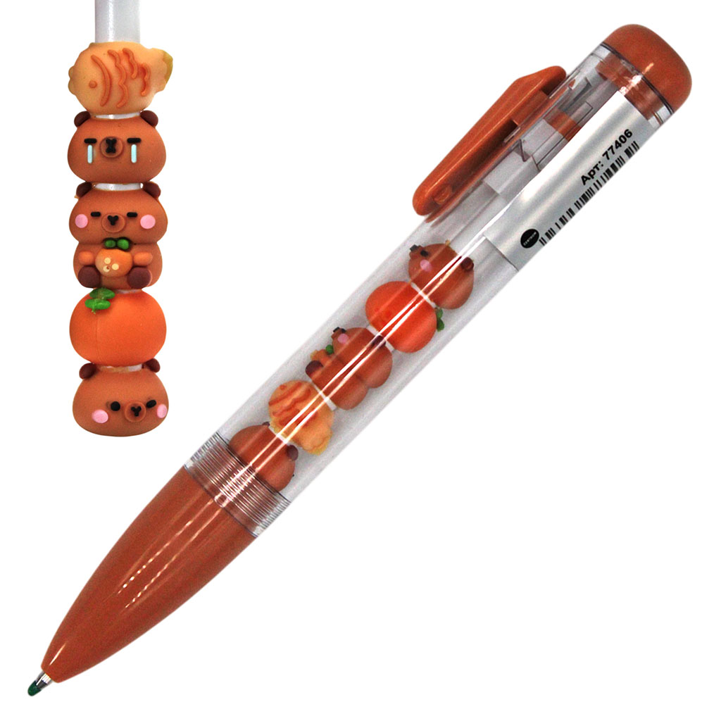 Изделие представлено в круглом полупрозрачном корпусе с фигурным дополнением внутри. Забавные мордочки капибар и другие фигурки, представляют из себя прорезиненные бусины, нанизанные на стержень, которые можно с легкостью менять местами. Автоматический нажимной механизм обеспечивает плавную подачу стержня. Металлический наконечник диаметром 0,5 мм. создает четкие, не прерывистые линии, обеспечивая плавное и мягкое письмо. Цвет чернил – синий. Дизайн в ассортименте. Упаковка - фирменный картонный стенд.